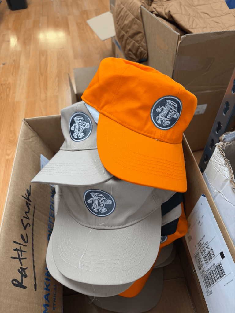 - Embroidered hats + screen printed shirts for complete branded sets